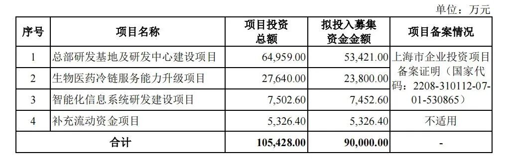 根據此次募資安排,上海生生將5.34億元重點用于“總部研發基地及研發中心建設項目”(下稱“總部項目”),占比將近六成,目的正在于鞏固技術領先優勢與行業競爭力。剩余的資金,2.38億元用于“生物醫藥冷鏈服務能力升級項目”、7452.60萬元用于“智能化信息系統研發建設項目”,還有5326.40萬元用于補充流動資金。