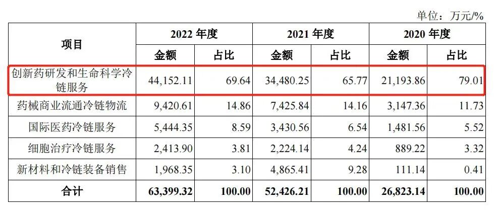 其中,“創新藥研發和生命科學冷鏈服務”是收入的第一來源,報告期內創造收入2.12億元、3.45億元、4.42億元,占主營收入的比例分別為79.01%、65.77%、69.64%。排在第二位的“藥械商業流通冷鏈物流”業務,收入份額雖逐年提升,但相比之下遠遠不及,占比分別為11.73%、14.16%、14.86%。