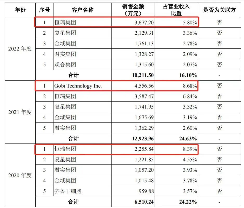 報告期內,來自前5名客戶的應收賬款賬面余額合計為2427.89萬元、3784.77萬元、3299.54萬元,占應收賬款余額的比例分別為32.64%、28.84%、18.98%,主要來自恒瑞集團、石藥集團、金域集團。