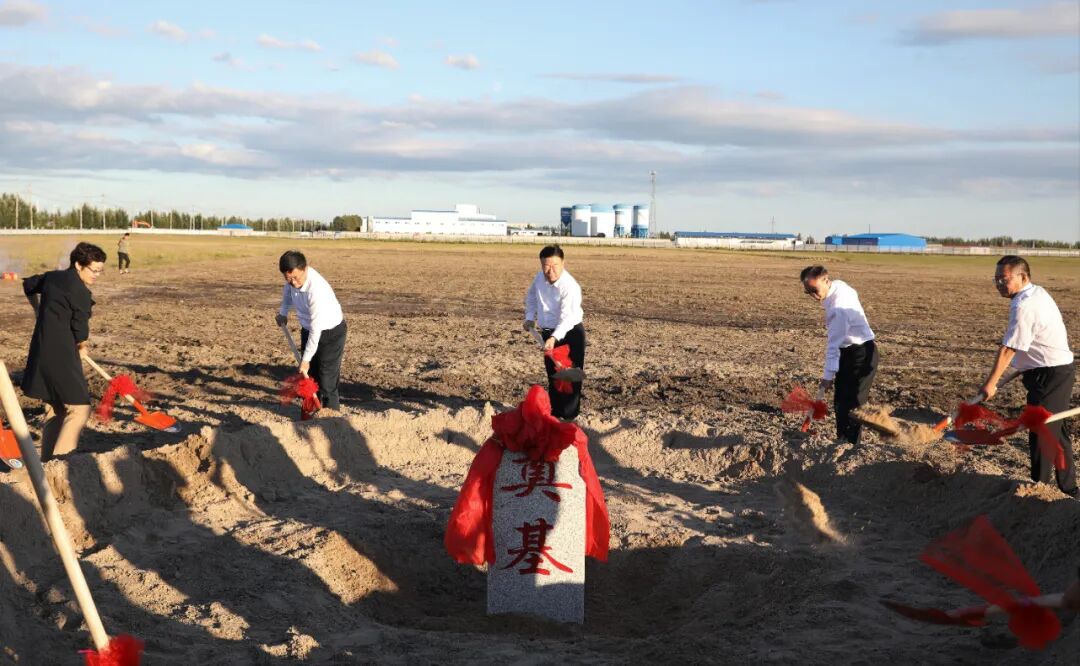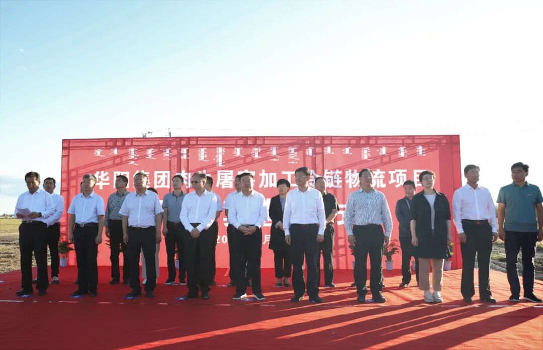 自治區黨委常委、盟委書記張恩惠,山東省濱州市委書記、市人大常委會主任佘春明,農行內蒙古分行黨委書記、行長張春林,濱州市和興安盟領導王曉娟、許寶全、呼和、張冰宇以及華陽清真肉類有限公司董事長楊廣根出席開工儀式,并為肉牛屠宰加工冷鏈物流項目培土奠基。