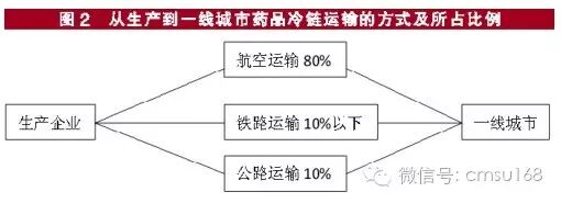 這個階段冷藏藥品物流的特點是相對批量較大,出發地和目的地距離一般較遠,交通比較發達。在這個階段,冷藏藥品空運的比例在70%左右,在四川、重慶、貴州等地,甚至高達90%以上,少量冷鏈藥品使用公路運輸或鐵路運輸方式(見圖2)。