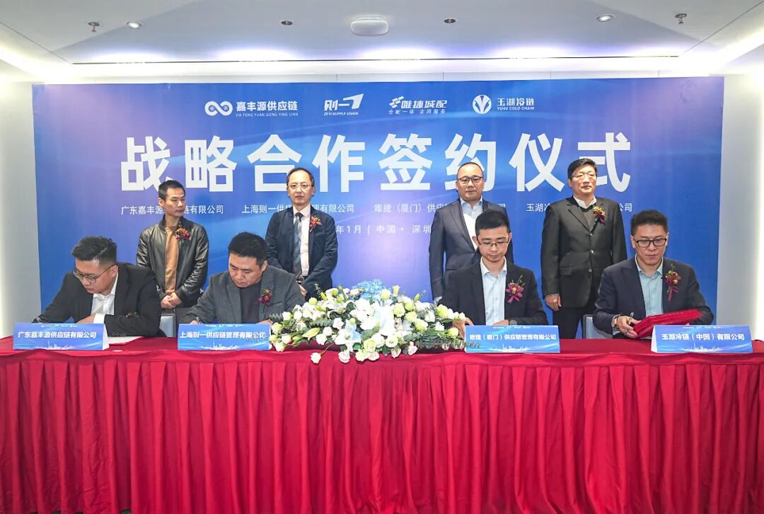 1月12日,中物聯冷鏈委副會長單位——玉湖冷鏈(中國)有限公司(以下簡稱「玉湖冷鏈」)與唯捷(廈門)供應鏈管理有限公司(以下簡稱「唯捷城配」)、廣東嘉豐源供應鏈有限公司(以下簡稱「嘉豐源供應鏈」)、上海則一供應鏈管理有限公司(以下簡稱「則一供應鏈」)戰略合作框架協議簽約儀式在深圳玉湖冷鏈商務中心舉行。 在玉湖冷鏈總裁盧朋,唯捷供應鏈總裁王琦,則一供應鏈國際事業部業務副總李育翰,嘉豐源供應鏈總經理助理李欣的見證下,玉湖冷鏈首席運營官兼廣州公司董事長孟凡武和唯捷供應鏈副總裁張繼恒、則一供應鏈華南大區總經理胡磊、嘉豐源供應鏈董事林澤鋒分別代表四方企業完成簽約。