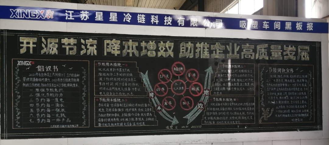 徐州生產基地管理部門年初便下發“節能降耗倡議書”,各級領導、各部門、車間組織宣傳、落實,并制作以“開源節流、降本增效、助推企業高質量發展”主題黑板報,向廣大基層員工進行宣傳,形成“全員參與、從我做起”的文化氛圍。