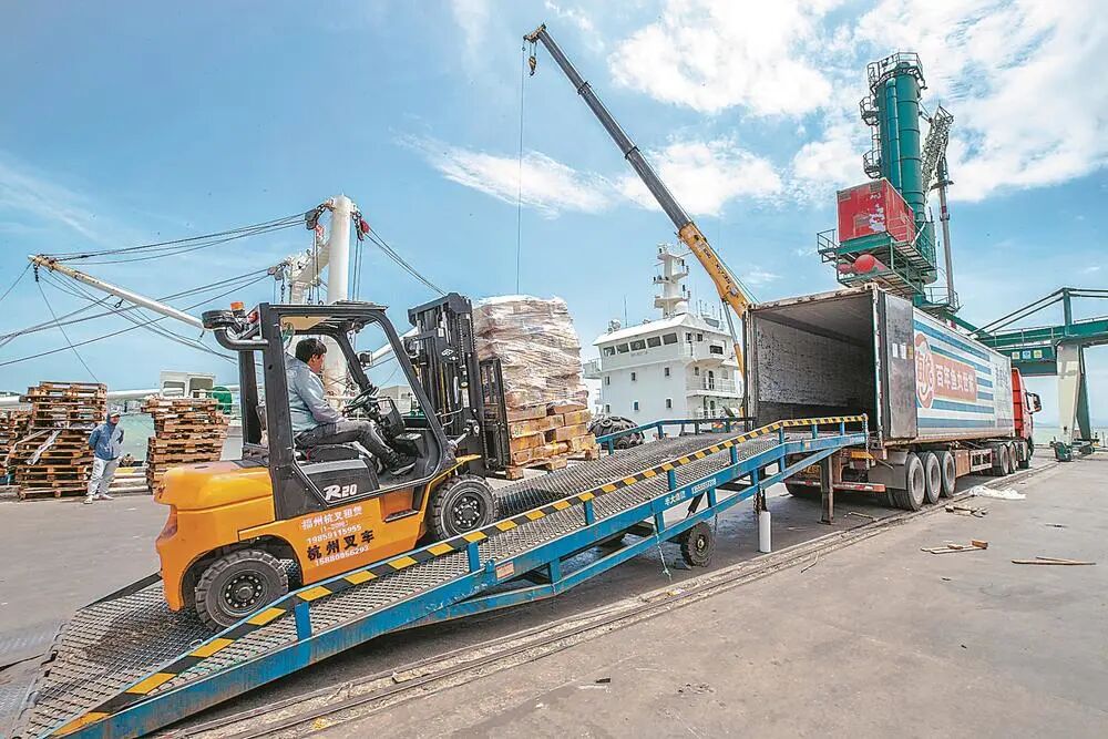 5日,運往元洪國際食品展示交易中心冷庫的漁獲正在元洪碼頭裝上運輸車。