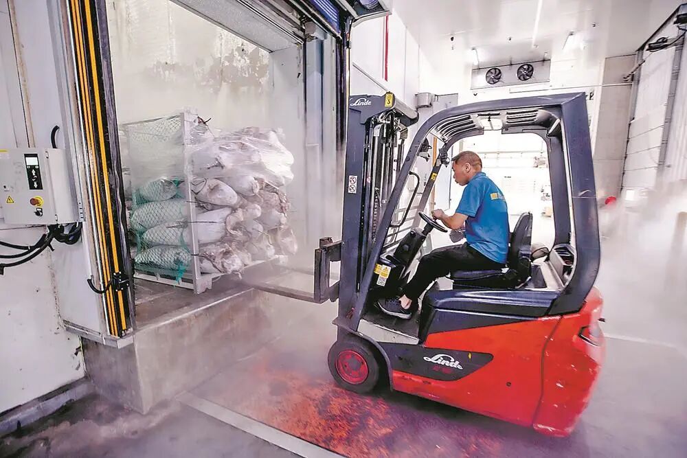 6日,福建省正福冷鏈物流有限公司的工人正開著叉車把漁獲送入超低溫冷庫。