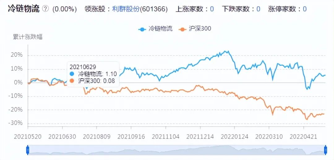 在政策性利好形勢下,最近一年A股市場冷鏈物流概念股與滬深300指數走出截然不同的趨勢,詳見下圖。