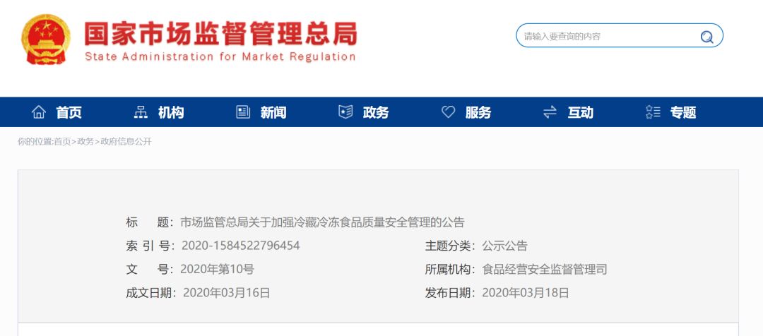 市場監管總局關于加強冷藏冷凍食品質量安全管理的公告