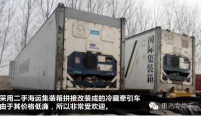 當前冷藏牽引車主要有廂式冷藏半掛車和冷藏集裝箱半掛車兩種,其中,冷藏集裝箱半掛車很多是用二手海運集裝箱改成的非正規冷藏半掛車,由海運集裝箱改裝的冷藏貨廂價格非常低廉,回本快。在一段時間內曾很受歡迎,但其缺點也是非常的明顯,它由二手冷藏集裝箱改裝而成,自重較重,保溫性能差,使用壽命短,油耗高,整車自重利用系數較低,制冷系統多為淘汰產品,制冷效果和穩定性較差。