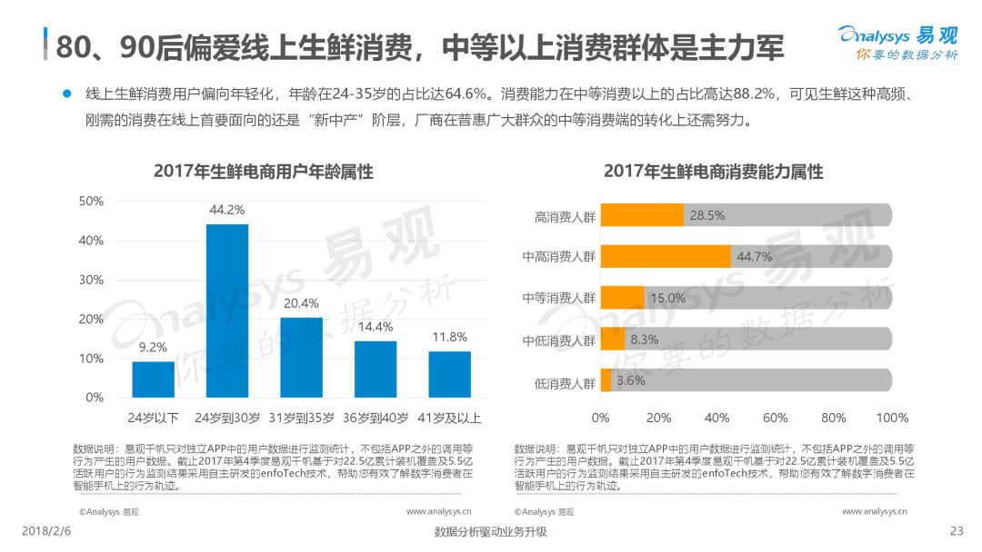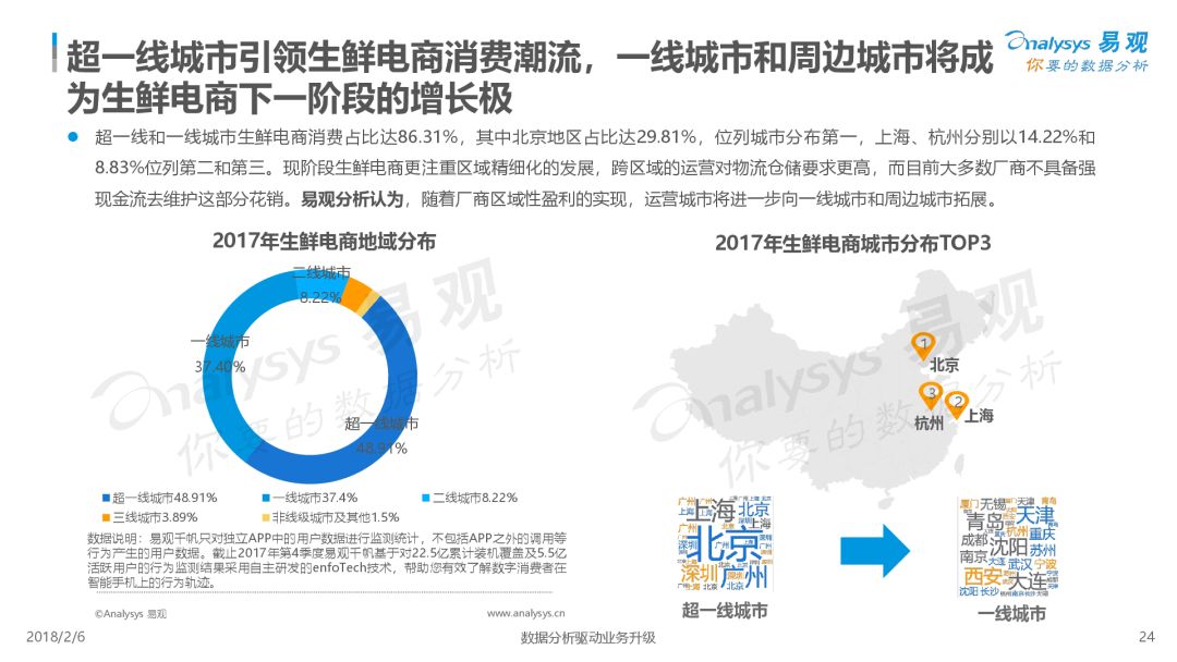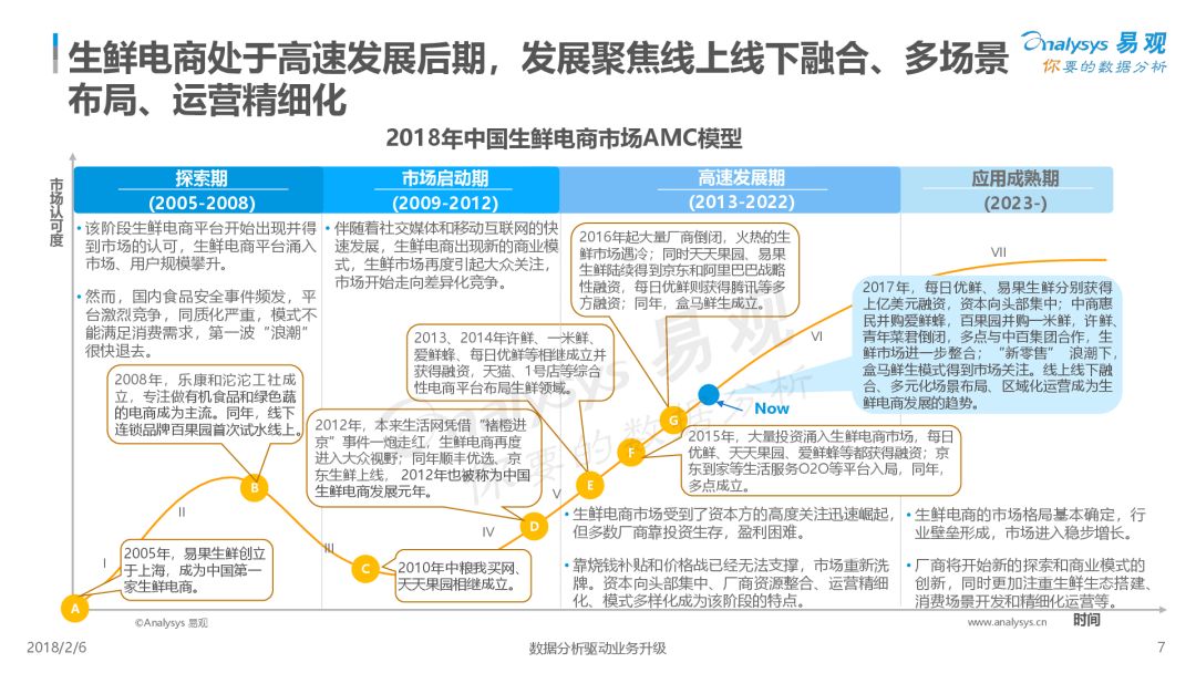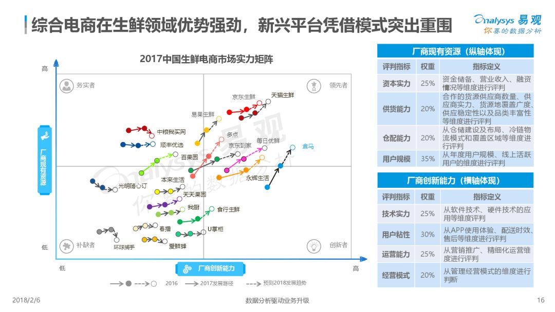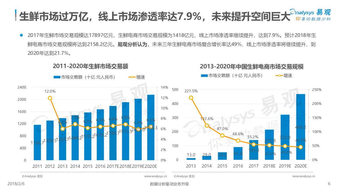 第1480期 從生鮮零售本質出發,冷鏈倉儲物流是生命線。而行業玩家們,誰能沉淀冷鏈倉儲物流能力誰將成贏家。 來源 | 易觀 作者 | 易觀 2017年,生鮮電商借「新零售」的東風再次被點燃,已經發展了15年并且有萬億市場商機的生鮮電商,線上滲透率仍不足10%。在市場投資收緊并向頭部聚攏的環境下,存活下來的生鮮電商發揮自身優勢,尋求不同發展路徑,巨頭企業探索滲透線下市場,新興廠商精細化運營謀求出路。 未來以來,將至已至,面對席卷而來的「零售」新浪潮,生鮮電商將以何種姿態迎接未來? 本報告從市場現狀、用戶分析、典型廠商、發展趨勢四個維度對生鮮行業進行了具體分析。 *本文版權歸易觀所有 *轉載來源: https://www.analysys.cn/analysis/trade/detail/1001196/ 推薦閱讀 【運聯研究】物流冷鏈服務公司決勝千里的攻城獅——信息系統大揭秘 點擊 閱讀原文 了解更多詳情