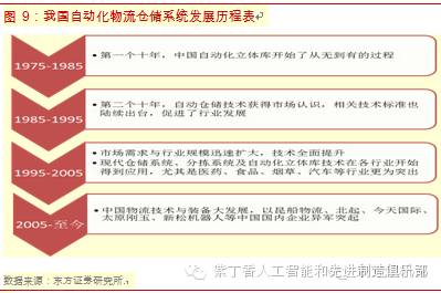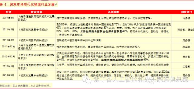 我們強烈看好工業4.0的核心組成部分 - 智能物流倉儲裝備行業。智能化和自動化是降低全社會物流費用率的終極解決方案,看好行業未來3-5年成長為千億市場容量的新興產業,尤其是電商、第三方物流、冷鏈生鮮等新興流通方式的崛起將帶動中高端智能物流需求井噴式增長,國內企業在智能物流行業的技術積累好于工業4.0其它領域,并且正在加速吸收國外先進技術,有望快速切入中高端市場、實現高速成長。