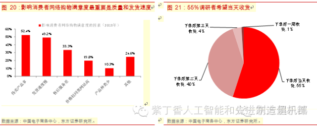 發貨速度是決定電商用戶體驗核心要素之一:我們認為電商的興起為物流倉儲自動化市場帶來了歷史性機遇,根本原因在于用戶體驗是電商差異化競爭的重要因素,而一個高效的現代物流中心可以很大程度上縮短發貨時間、優化用戶體驗。在國內電商交易額飛速增長的同時,物流基礎設施和設備投入嚴重滯后已經越來越成為制約行業的掣肘。據中國電子商務研究中心的調查,2013年影響消費者網購選擇最大的兩個因素是質量和物流,其中約49.2%的消費者提及發貨速度慢影響網購滿意度。另一項調研結果表明,約55%的網購消費者希望下單當天能收貨,希望兩天內收貨的占到95%之多。尤其在3C、化妝品等沖動型消費領域,發貨速度對消費選擇的影響更大。承諾“閃電發貨”、“上午下單下午送達”已經成為京東、易迅等近年迅速崛起的電商最重要的競爭手段之一。