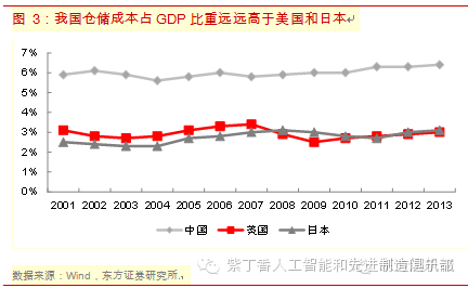 智能物流是工業4.0核心組成部分,是降低社會倉儲物流成本的終極方案:在工業4.0的智能工廠框架中,智能物流倉儲位于后端,是連接制造端和客戶端的核心環節。與美國、日本國外發達國家相比,單位GDP中我國的倉儲成本占比是其他國家的2-3倍,并且這一差值近些年來呈現逐步擴大的趨勢,而智能物流倉儲系統具備勞動力成本的節約、對租金成本的節約、管理效率的提升等方面優勢(我們估算自動化倉儲在保證同等儲存能力的條件下,可至少節約70%以上的土地和80%以上的勞動力),是降低社會倉儲物流成本的終極解決方案;