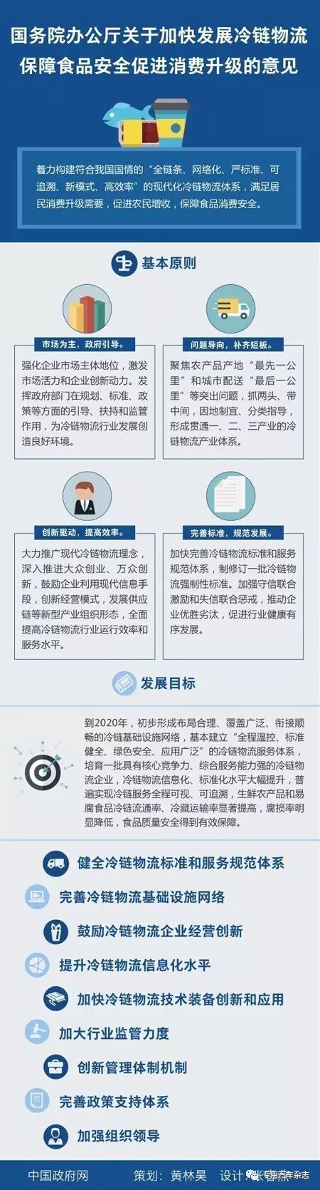 《意見》提出八方面措施:其中第五條明確指出:加快冷鏈物流技術裝備創新和應用。加強基礎性研究以及核心技術工藝等的自主研發,加速淘汰不規范、高能耗的冷庫和冷藏運輸車輛,提高冷藏運輸車輛專業化、輕量化水平,推廣標準冷藏集裝箱。