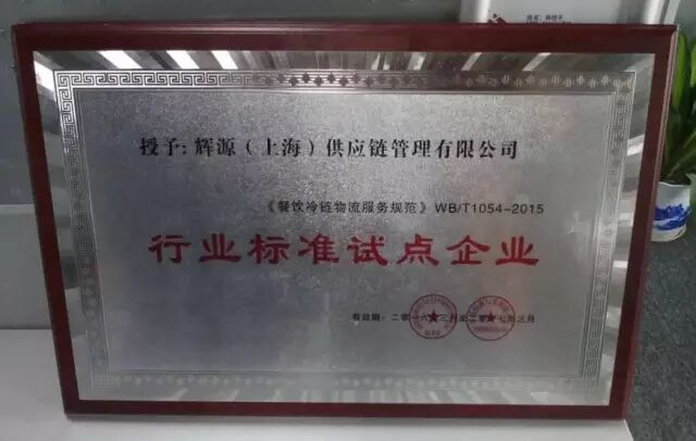 輝源榮譽|輝源(上海)榮獲行《餐飲冷鏈物流服務規范》業標準試點企業