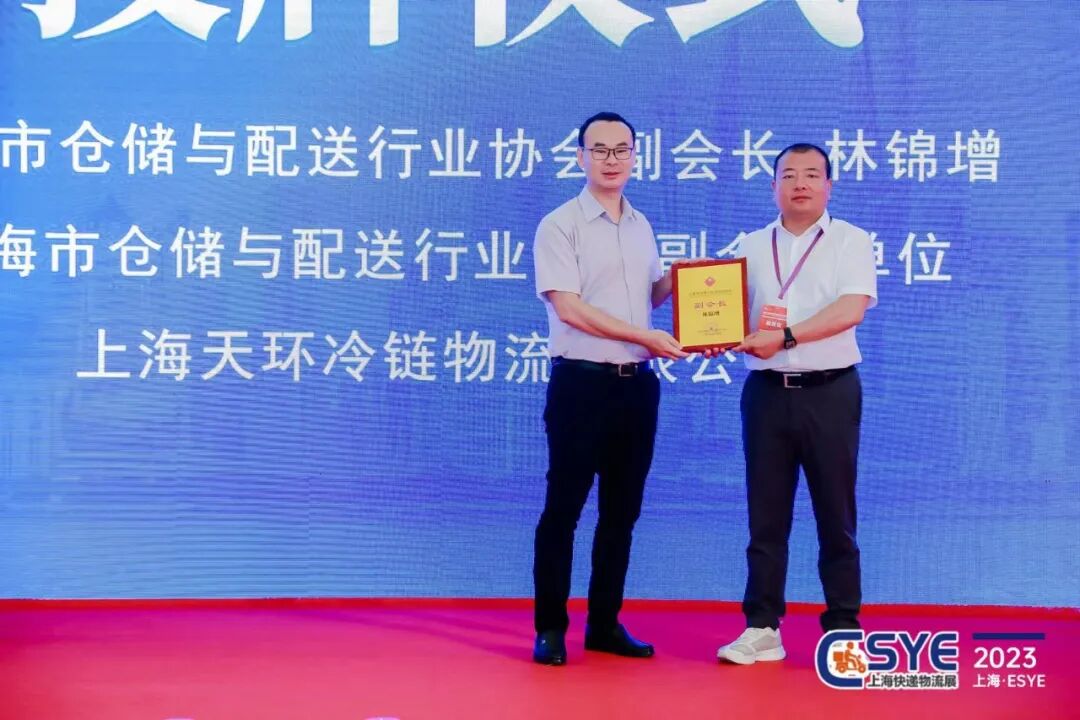 7月5日,2023上海國際快遞物流產業博覽會暨2023中國倉配物流創新與發展高峰論壇暨數字化、智能化、綠色化發展會議圓滿舉辦。會上,上海市倉儲與配送行業協會會長蔣衛兵向上海天環冷鏈物流有限公司頒發副會長牌匾和證書,天環集團董事長、上海市倉儲與配送行業協會副會長林錦增參加授牌儀式。