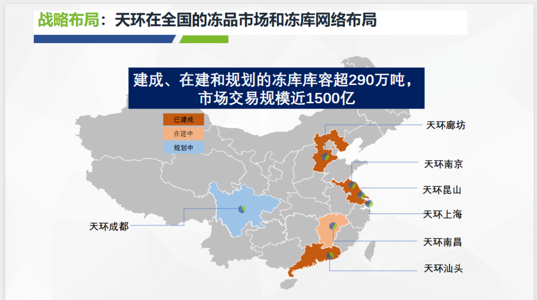 天環集團已經完成江蘇昆山、南京;江西南昌、河北廊坊、廣東汕頭等地全國凍品大型市場和冷庫網絡布局,建成、在建和規劃冷庫庫容超過290萬噸,市場交易規模超過1500億。
