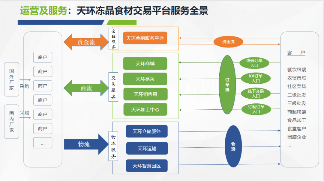 天環供應鏈依托已經建成凍品批發市場網絡,利用互聯網、物聯網等信息技術手段,通過對市場中商流、物流、信息流及資金流等供應鏈要素流程再造,打造線上線下融合互聯網交易平臺,深度鏈接餐飲、商超、團購、電商等渠道,做到品類最豐富、交易量最大、用戶數最多,市場輻射最廣,成為中國凍品食材第一流通平臺。
