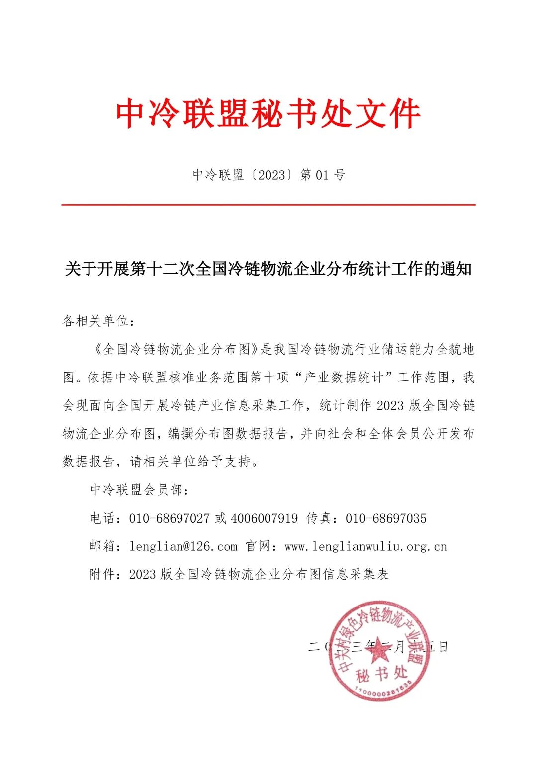 關于開展第十二次全國冷鏈物流企業分布統計工作的通知 各相關單位: 《全國冷鏈物流企業分布圖》是我國冷鏈物流行業儲運能力全貌地圖。依據中冷聯盟核準業務范圍第十項“產業數據統計”工作范圍,我會現面向全國開展冷鏈產業信息采集工作,統計制作2023版全國冷鏈物流企業分布圖,編撰分布圖數據報告,并向社會和全體會員公開發布數據報告,請相關單位給予支持。 中冷聯盟會員部: 電話:010-68697027或4006007919 傳真:010-68697035 郵箱:lenglian@126.com 官網:www.lenglianwuliu.org.cn 附件:2023版全國冷鏈物流企業分布圖信息采集表 二0二三年二月十五日 往期推薦中共中央、國務院發布重要文件,冷鏈高質量發展再迎利好
