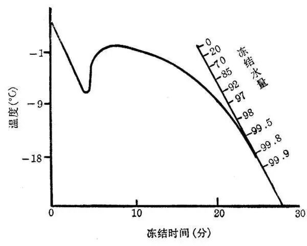 不同食物冰點不同,只有溫度足夠低時,食物中的大部分水才能凍結。當牛肉薄片的溫度為-4℃時,只有70%的水分被凍結;溫度下降到零下9℃左右時,也還有3%的水分未凍結;即使牛肉薄片的溫度降低到零下18℃時,也不是100%的水分都被凍結住。