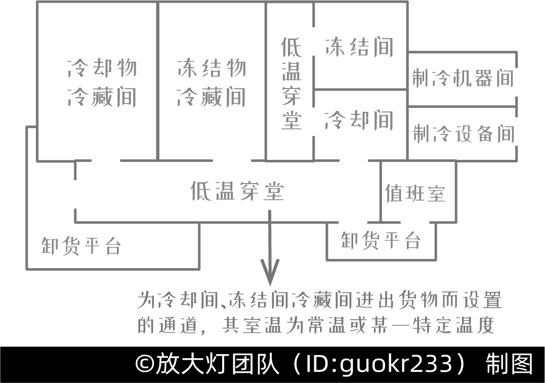 相比家用冰箱,冷庫中增加了冷加工食物的房間——冷卻間和凍結間,貨物需要按照固定順序完成降溫后才能貯藏。相應地,儲藏這兩種冷加工食品的房間就是對應的兩種冷藏間,這就像是“大冰箱”了。