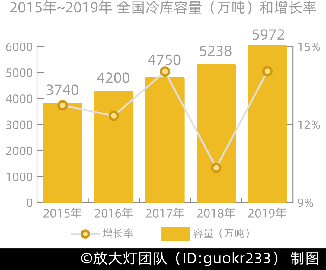 消費者增長的冷鏈需求促進了冷庫的建設。據中物聯冷鏈委統計,2015~2019年,我國冷庫總容量保持在10%以上增速平穩增長,截至2019年底,全國冷庫總量達到5972萬噸,新增冷庫容量為734萬噸,同比增長14.2%。