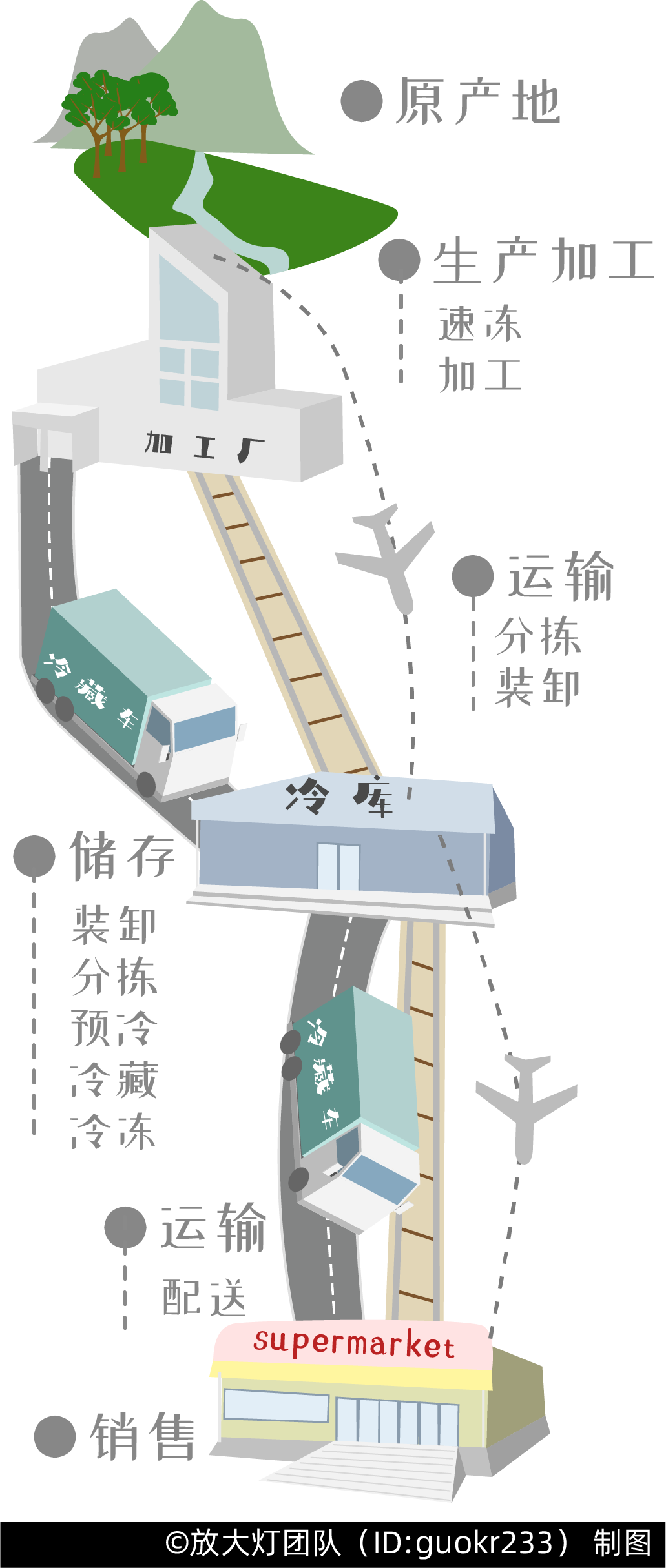 冷凍肉、冰淇淋、冰鮮水產、酸奶、冷凍果蔬等食物就是典型的冷鏈物品。在被消費者帶回家之前,它們需要經歷這些: