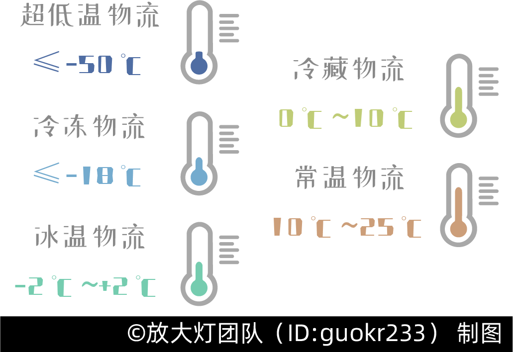 和你家冰箱分冷凍室冷藏室類似,冷鏈也有不同的溫度。《GB/T 28577 冷鏈物流分類與基本要求》按不同溫度區段將冷鏈物流分為了超低溫物流、冷凍物流、冷藏物流等。