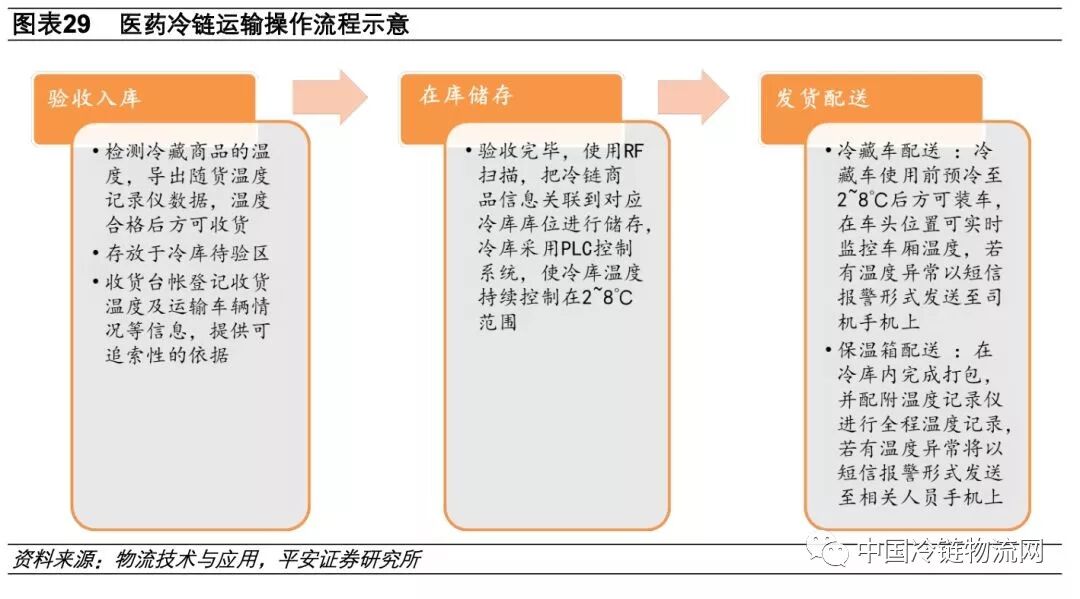 醫藥冷鏈相對于食品飲料冷鏈,技術要求更高,尤其是對全程溫度控制更加嚴格。為了保證藥品整個流通過程始終處于特定溫度區間內,醫藥冷鏈運輸具有嚴格的操作流程。驗收入庫的時候需要檢測溫度,查看記錄儀數據,合格后才驗收;發貨配送中實時監控溫度,若有異常,需立刻通知司機。
