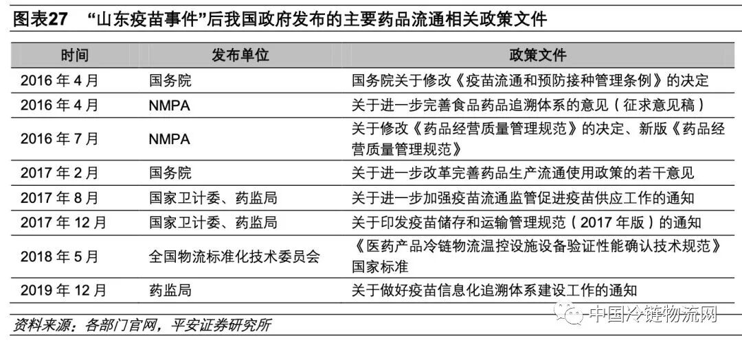 除行業自身需求推動以外,我國醫藥冷鏈物流近年來政策趨嚴,驅動行業進一步發展。我國對于醫藥冷鏈物流一直有明確的政策規定,不過早年在執行過程中并未嚴格遵守。眾多中小型配送商完全不具備冷鏈運輸條件,僅僅依靠冰袋冰箱降溫,成為藥品安全的極大隱患。直到2016年“山東疫苗事件”曝光,引起各單位對疫苗以及醫藥冷鏈運輸的重視。國家陸續出臺了多個規范藥品流通環節的文件;各流通公司也積極響應,例如國藥物流專門成立了冷鏈事業部。