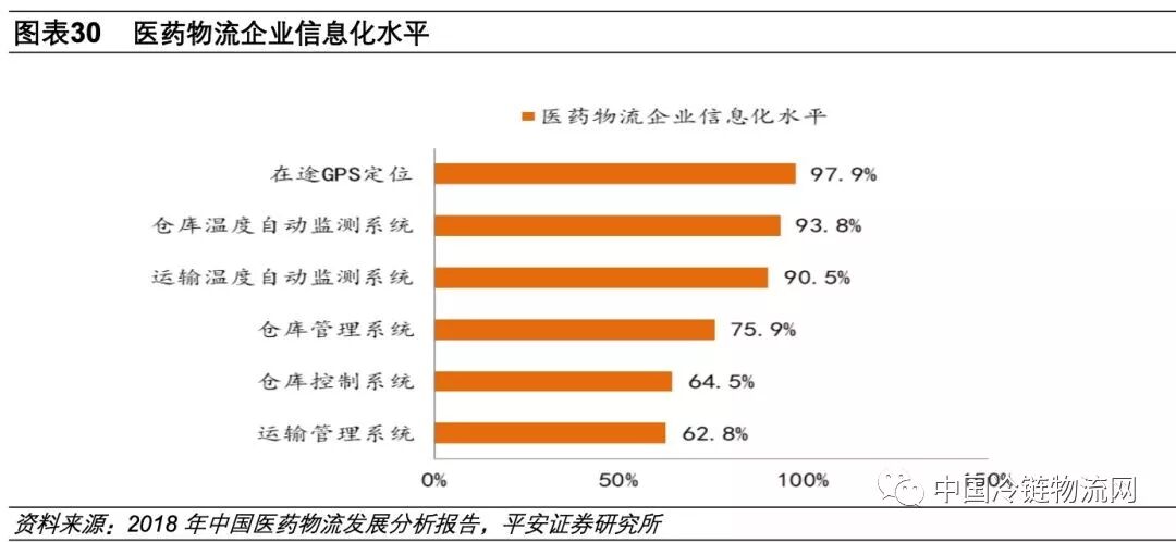 此外,醫藥冷鏈對信息化要求更高。根據中國醫藥(12.900, 0.06, 0.47%)商業協會醫藥物流數據庫中的941家醫藥企業的物流資源數據,我國醫藥冷鏈企業中,90%以上的企業配備了運輸溫度自動監測系統、倉庫溫度自動監測系統、在途GPS定位,60%以上的企業配備了運輸管理系統、倉庫控制系統和倉庫管理系統。