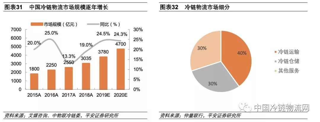我國冷鏈物流市場一方面由食品冷鏈、醫藥冷鏈需求增長所驅動,另一方面受政策的持續支持,市場前景廣闊。根據中物聯冷鏈委和艾媒咨詢數據,2018年我國冷鏈物流市場規模達3035億元,同比增長19%,預計2019年和2020年分別增長24.5%和24.3%。冷鏈物流屬于綜合性行業,其中冷鏈運輸、冷鏈倉儲和其他服務(庫內操作、打包和貼標等服務)分別占比約40%、30%和30%。