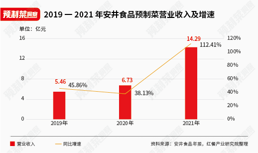 近幾年,預制菜在安井產品結構中的占比逐年增大,也一直保持較高的收入增長速度。2019年-2021年,安井食品預制菜的營業收入分別為5.46億元、6.73億元、14.29億元,同比分別增長45.86%、38.13%、112.41%,2021年占總營收的14.21%。其中,新宏業的小龍蝦制品的增量是其預制菜業務營收大漲的主要原因之一。