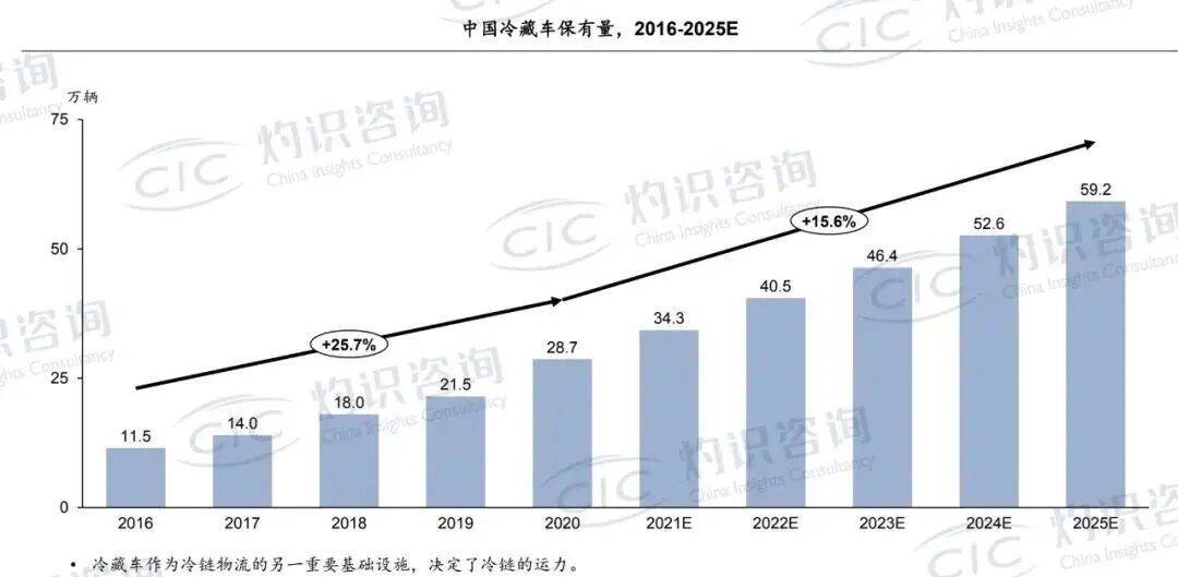 中冷聯盟數據顯示,我國一二線城市的冷藏車數量已經逐步從稀缺過渡到相對過剩,2021年我國冷藏車累計銷售79895輛,同比(2020年冷藏車終端銷量為67205輛)增長19%。2021年我國冷藏車保有量超30萬,灼識咨詢預計,到2025年,我國冷藏車將增長至接近60萬輛。